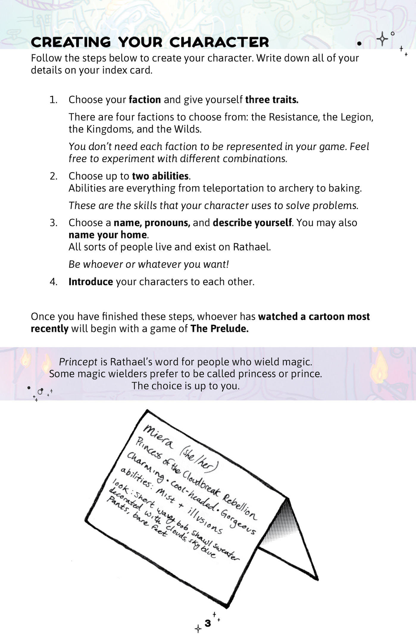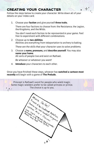 Character-driven GMless narrative roleplaying game, inspired by She-Ra and the Princesses of Power. Shows a strong understanding of best practice for consent between players, particularly in the scene guidance and mechanics for Meeting Hand to Heart. The game also notes that “Princess is not a gendered term in this game. It is Athera’s word for magician or spell caster. Anyone can be a princess, and these princesses usually don’t need saving." At time of review, it is still in beta. E4/5 stars - excellent.