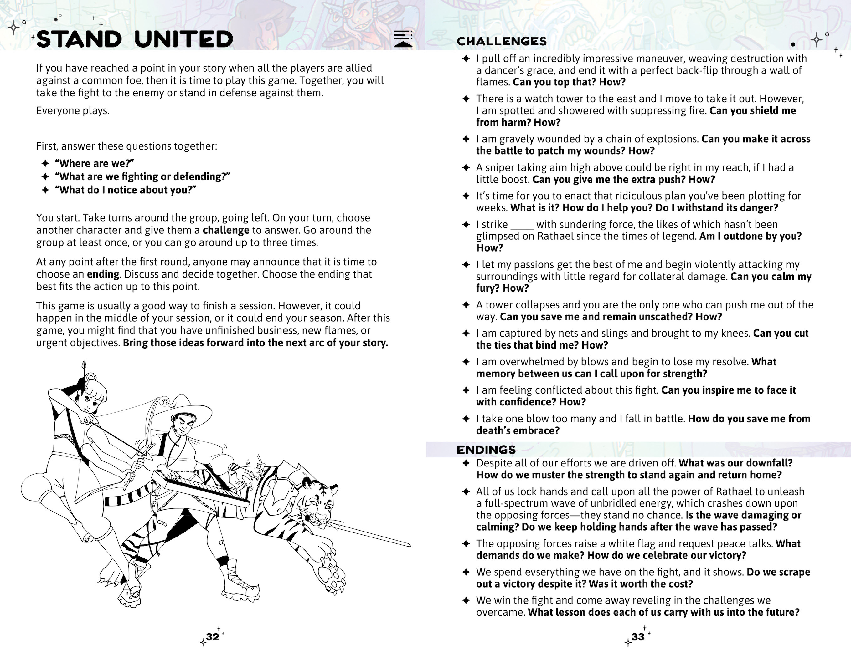 Overall, I think the only spot that felt missing was NPCs. In FTH, they seem more like momentary props that you pick up and speak through during a minigame, which makes minigames like Stand United feel a bit off. Unless there's a major NPC that the whole group is taking care to incorporate and build up as a villain, it seems like it'd make more sense to Stand United against another PC, and I'm not sure that's the intended direction of the game---even if FTH does work as a very solid mechanical foundation for a pvp story.